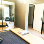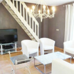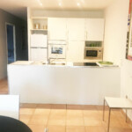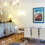 Vaste séjour-salon avec climatisation et une table pour 10 personnes, une belle cuisine intégrée moderne (2019), un salon en cuir blanc, 3 chambres et 2 salles de bain avec 2 WC dont un séparé.